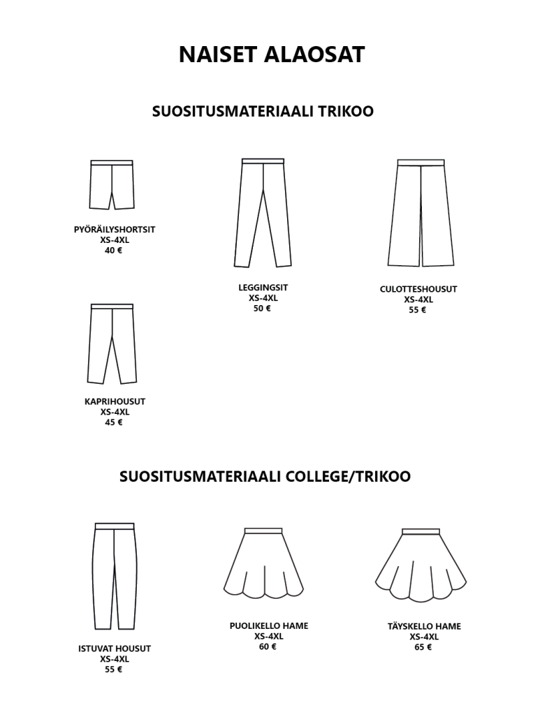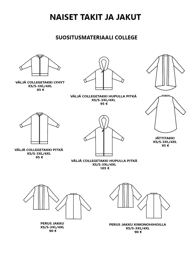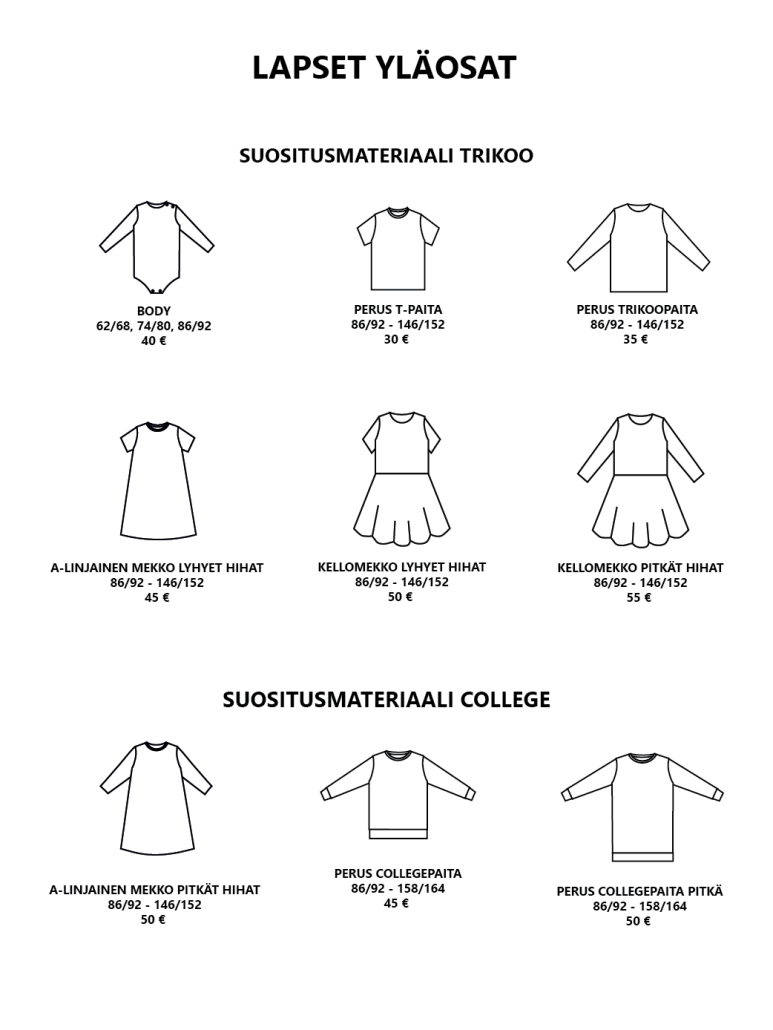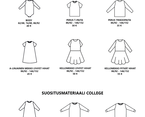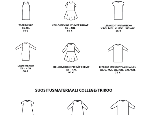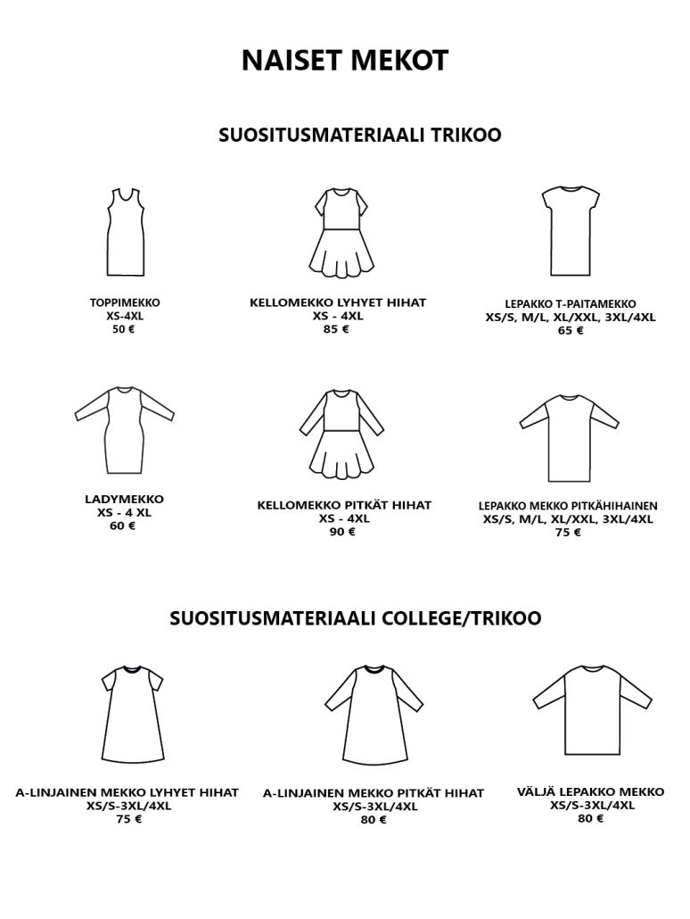 Pääset selaamaan valmiiksi hinnoiteltuja vaatemalleja alla olevasta katalogista. Hinnat sisältävät valmiin vaatemallin ja valmistuksen. Kankaan hinta ei sisälly hintaan. Mikäli haluat lisätä vaatteeseen taskut tai halkiot lisätään hintaan 10 €. Muut mallimuutokset hinnoitellaan erikseen.