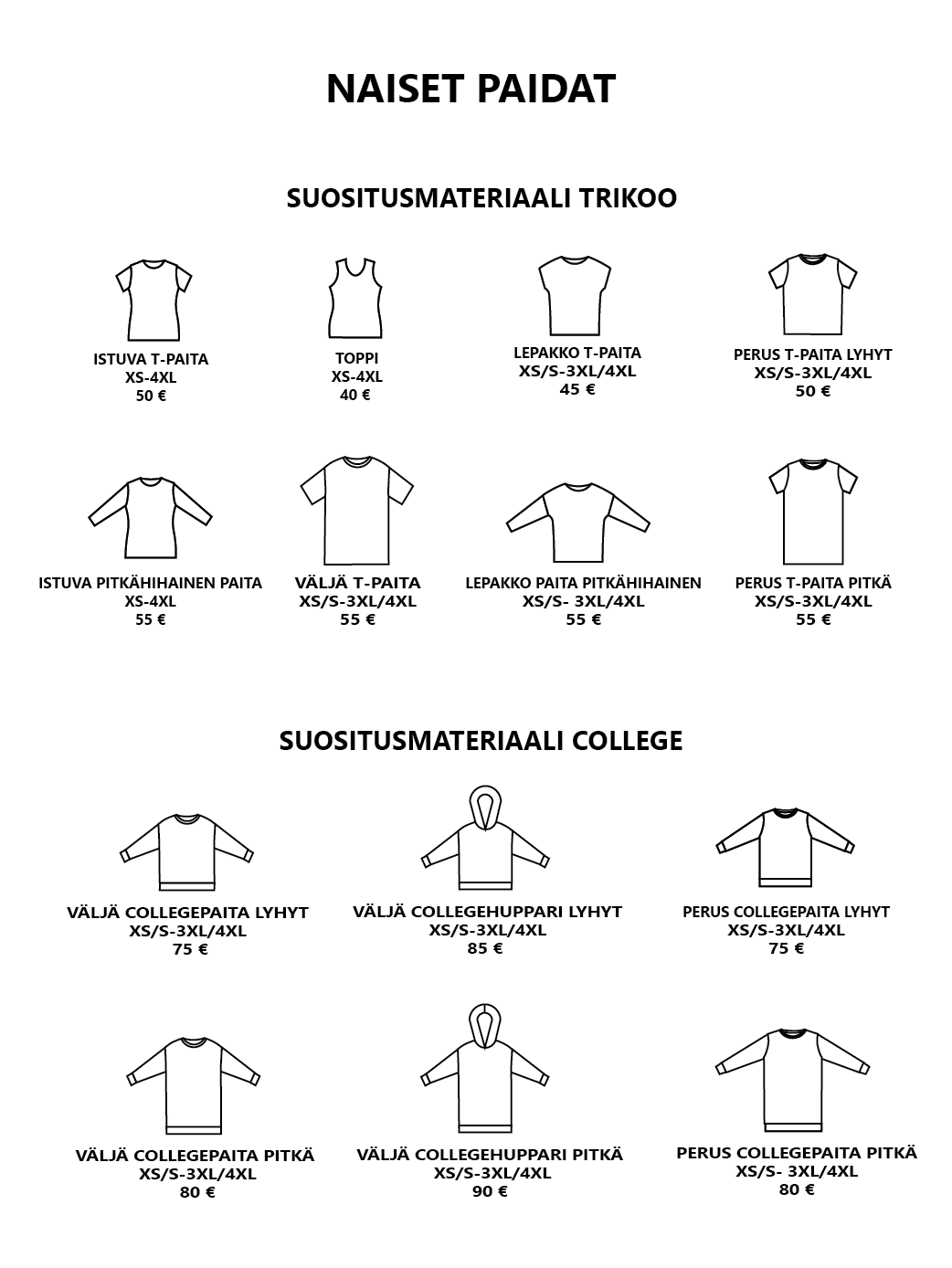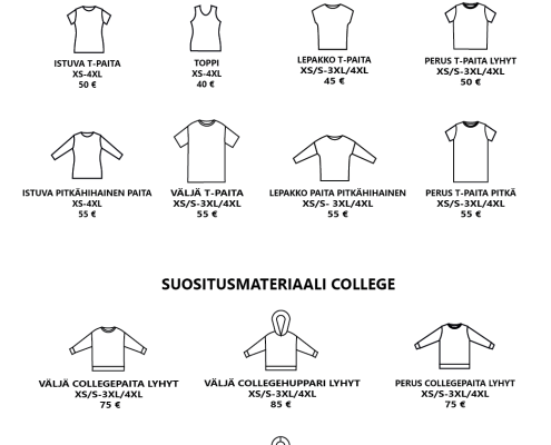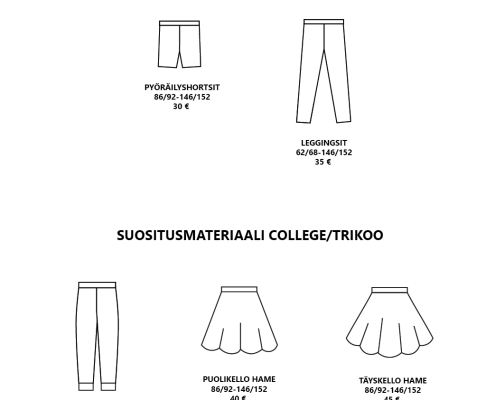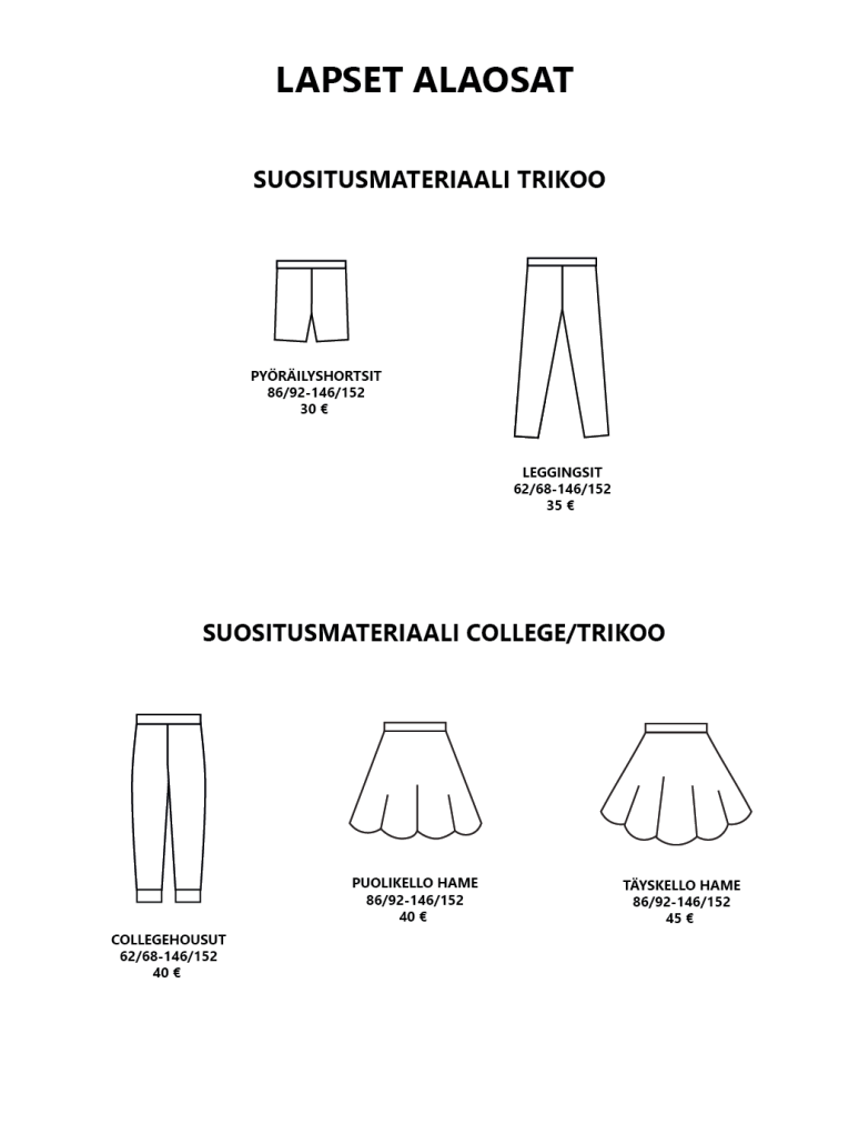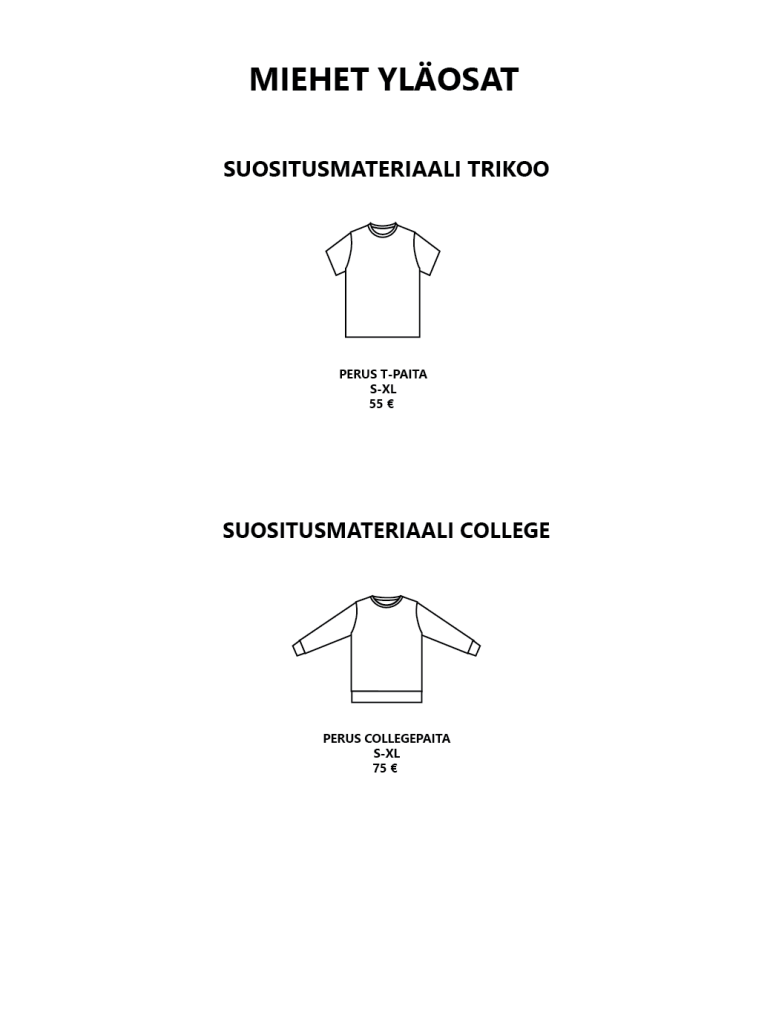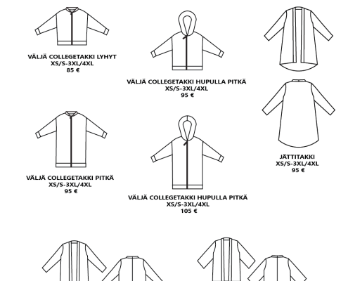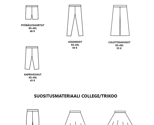 Pääset selaamaan valmiiksi hinnoiteltuja vaatemalleja alla olevasta katalogista. Hinnat sisältävät valmiin vaatemallin ja valmistuksen. Kankaan hinta ei sisälly hintaan. Mikäli haluat lisätä vaatteeseen taskut tai halkiot lisätään hintaan 10 €. Muut mallimuutokset hinnoitellaan erikseen.